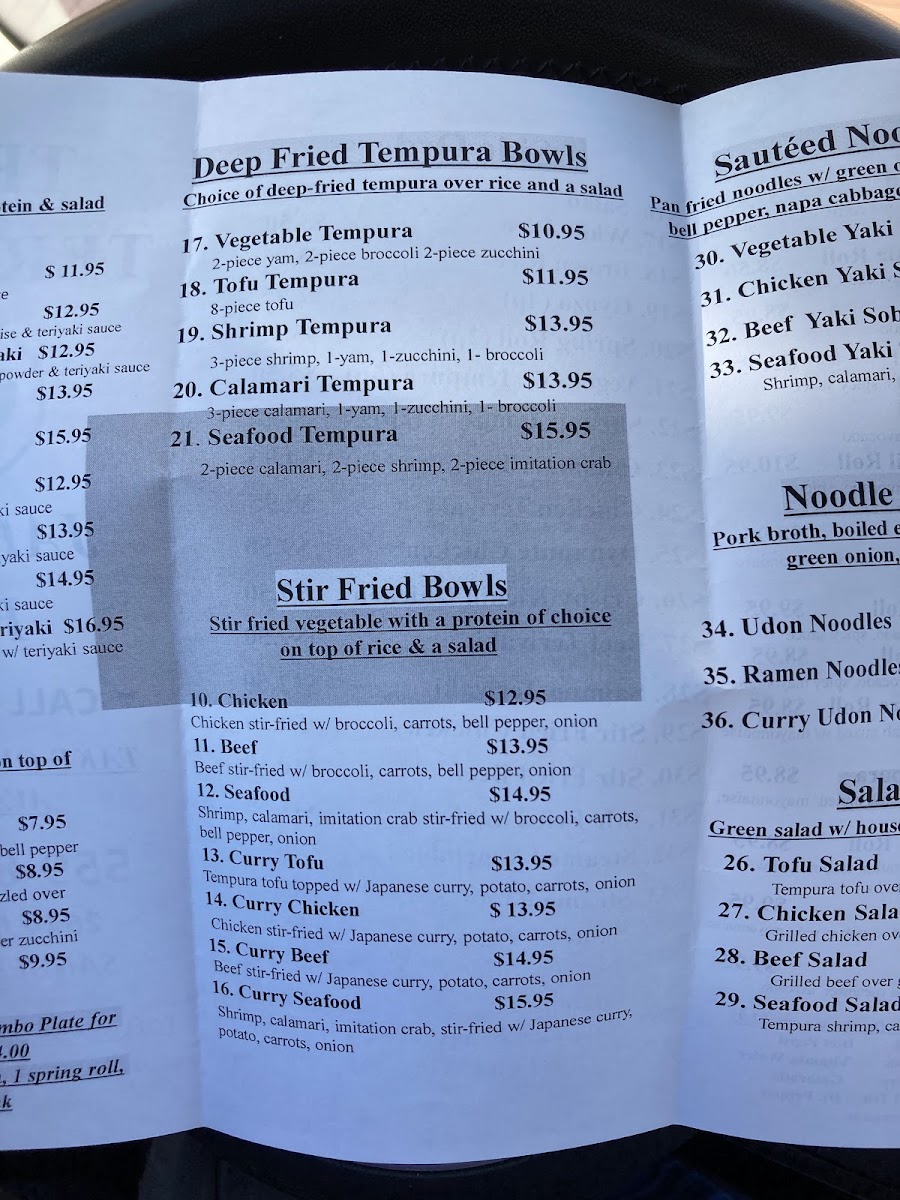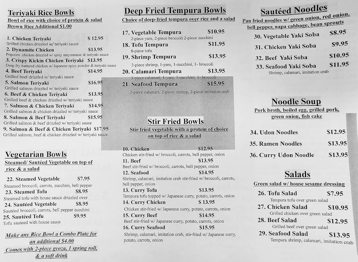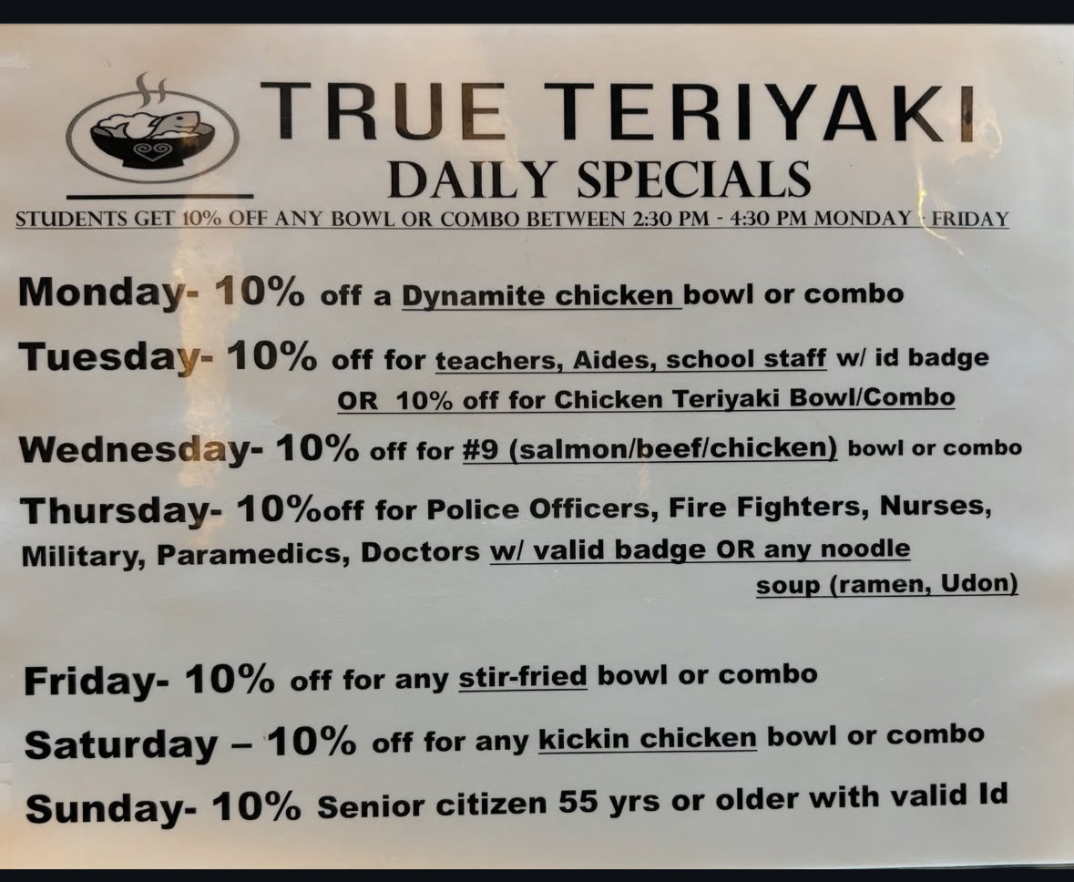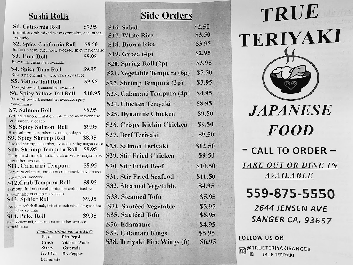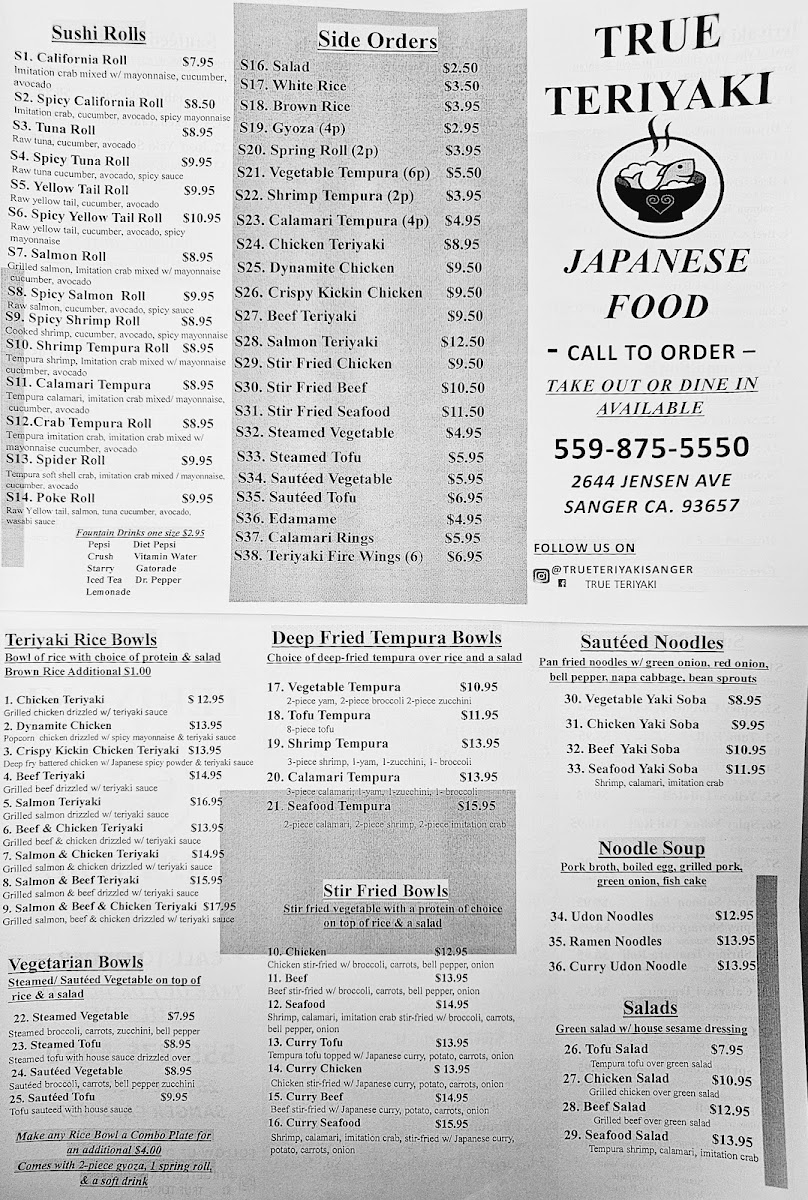 From a reviewer’s perspective, the menu at True Teriyaki offers a well-rounded selection that covers everything from sushi to hearty rice and noodle bowls, making it easy to find something satisfying at a reasonable value. The sushi roll options like California Roll, Spicy California Roll, Tuna Roll, Spicy Tuna Roll, and Yellow Tail Roll provide classic choices, while sides such as Salad, White Rice, Brown Rice, Gyoza, and Spring Roll complement any meal nicely. For something crispy, the tempura bowls including Vegetable Tempura, Tofu Tempura, Shrimp Tempura, Calamari Tempura, and Seafood Tempura are great comfort options. The noodle section features flavorful dishes like Vegetable Yaki Soba, Chicken Yaki Soba, Beef Yaki Soba, and Seafood Yaki Soba, while the popular teriyaki rice bowls such as Chicken Teriyaki, Dynamite Chicken, Crispy Kickin Chicken Teriyaki, Beef Teriyaki, and Salmon Teriyaki are likely the highlights for many customers. There are also vegetarian choices like Steamed Vegetable, Steamed Tofu, Sautéed Vegetable, and Sautéed Tofu, along with stir-fried options including Chicken, Beef, Seafood, Curry Tofu, and Curry Chicken. To round out the menu, lighter options like Tofu Salad, Chicken Salad, Beef Salad, and Seafood Salad, plus comforting bowls such as Udon Noodles, Ramen Noodles, and Curry Udon Noodle, ensure there is something for every taste, making the menu diverse, filling, and satisfying overall.